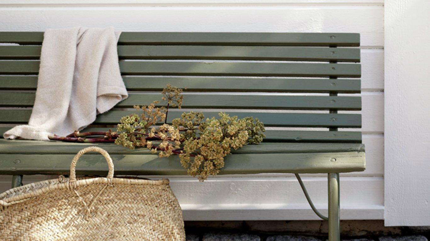 Fasaden på bildet over er malt med Jotun 1105 Villahvit, benken Jotun 8413 Herrgardsgrønn. Foto:Jotun