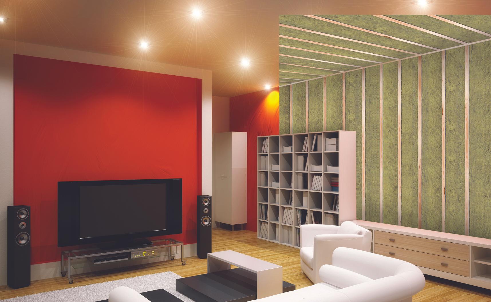 For å unngå at lyden forplanter seg i veggen fra ett rom til et annet, er LYDPLATEN litt tynnere enn en vanlig steinullplate. Isolasjonsplaten kommer ikke i direkte kontakt med platekledningen og reduserer dermed muligheten for overføring av lydbølgene gjennom konstruksjonen. Av samme grunn er det er viktig å bruke elastisk fugemasse mellom overgang vegg og gulv/tak.